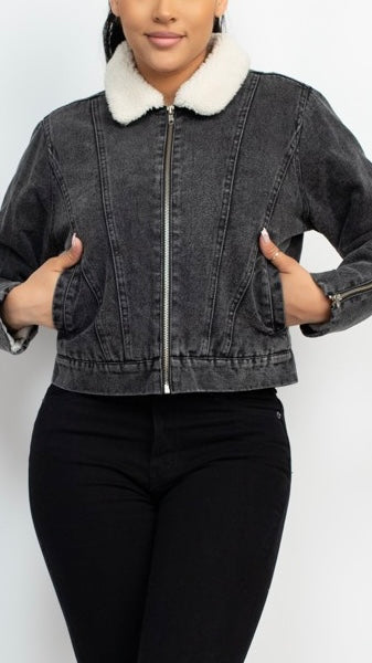 Si lo que quieres en sentirte calientita esta temporada de frio, esta chamarra de mezclilla negra con aplicaciones de peluche de borrego será tu aleada.