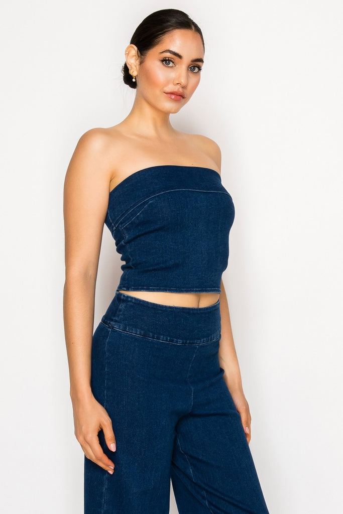 Top strapless de mezclilla con un diseño moderno y minimalista que resalta la silueta de forma elegante. Su corte ajustado crea un look sofisticado y femenino, perfecto para outfits contemporáneos.