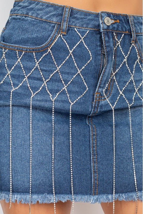 Falda mini de mezclilla con diseño moderno y detalles de pedrería que aportan un toque glam y sofisticado. El patrón decorativo en la parte frontal crea un efecto brillante que eleva el estilo clásico del denim.