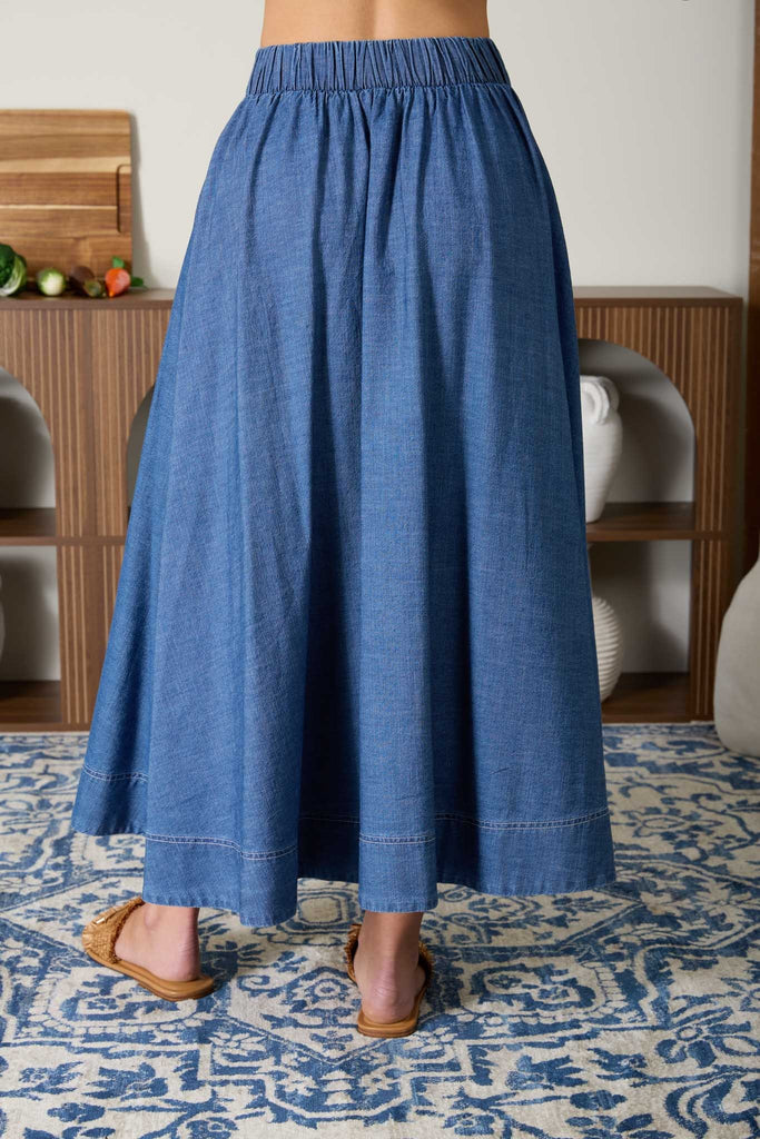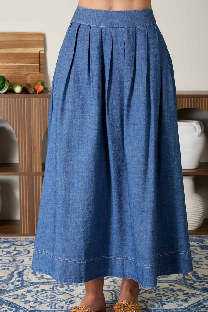Falda midi de mezclilla ligera en tono azul con diseño de pliegues al frente que aportan volumen y movimiento. Su silueta amplia y cintura alta estilizan la figura, creando un look femenino y cómodo.