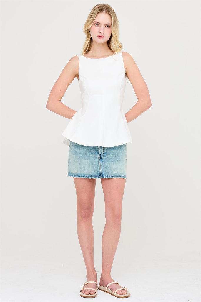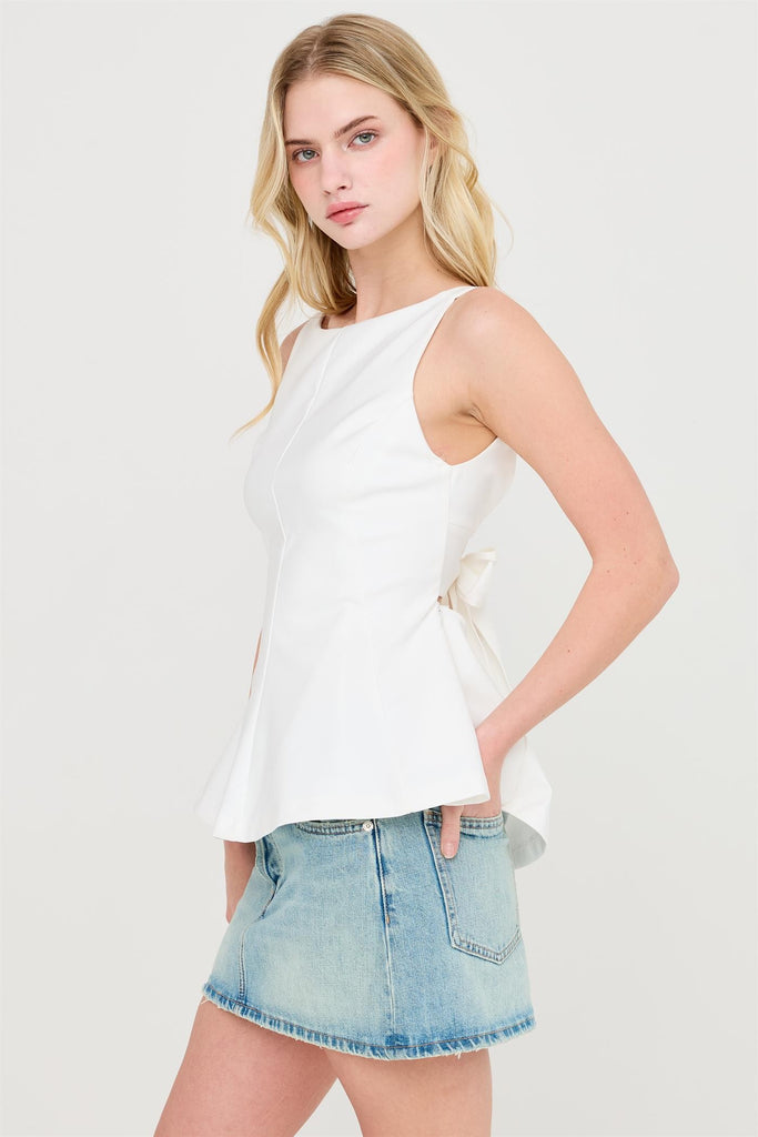 Esta blusa blanca peplum para mujer combina una silueta estructurada que estiliza la cintura con un delicado escote abierto en la espalda terminado en un moño romántico.