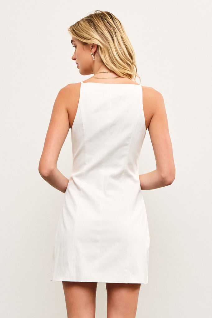 Este vestido blanco corto con botones frontales es una pieza versátil y sofisticada que estiliza la silueta gracias a su corte recto ligeramente ajustado. Su diseño de tirantes delgados y escote recto aporta un aire moderno y femenino.
