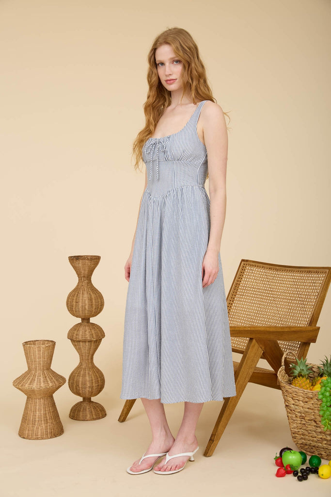 Vestido midi de rayas azul y blanco con un estilo fresco y femenino perfecto para días soleados. Su diseño con tirantes anchos y escote cuadrado con lazo decorativo crea una silueta romántica y favorecedora.