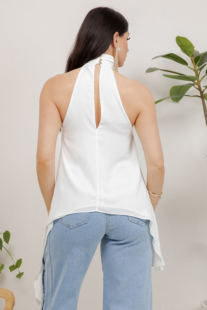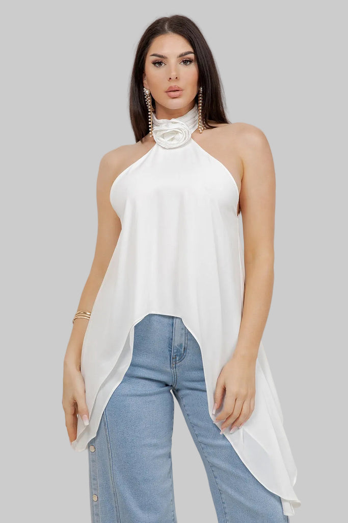 Esta blusa blanca halter para mujer destaca por su cuello alto con detalle floral y su caída asimétrica que crea movimiento y sofisticación al caminar.