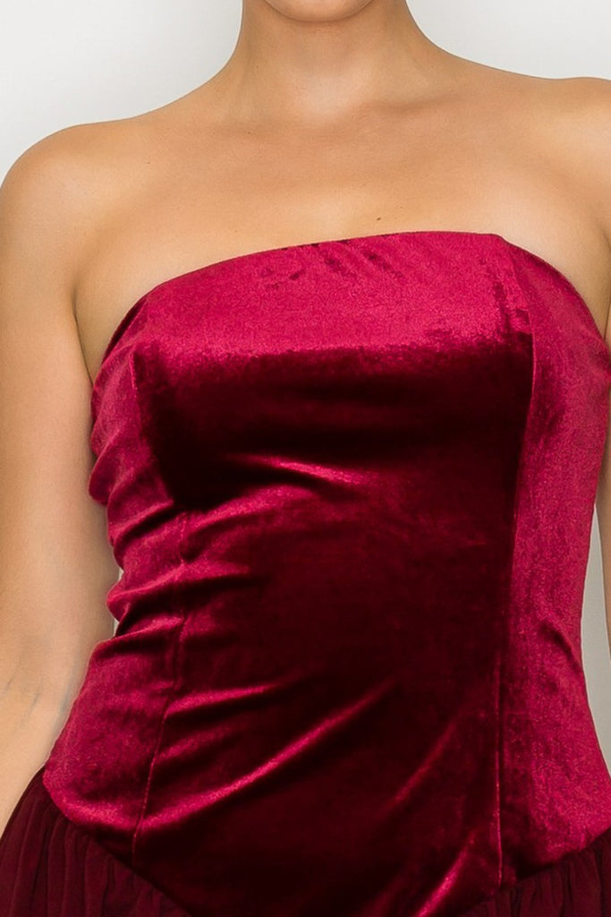 Un vestido sin tirantes de terciopelo con glamour al aire libre que presenta un escote ajustado, espalda elástica, falda con dobladillo abullonado, color sólido y largo mini.