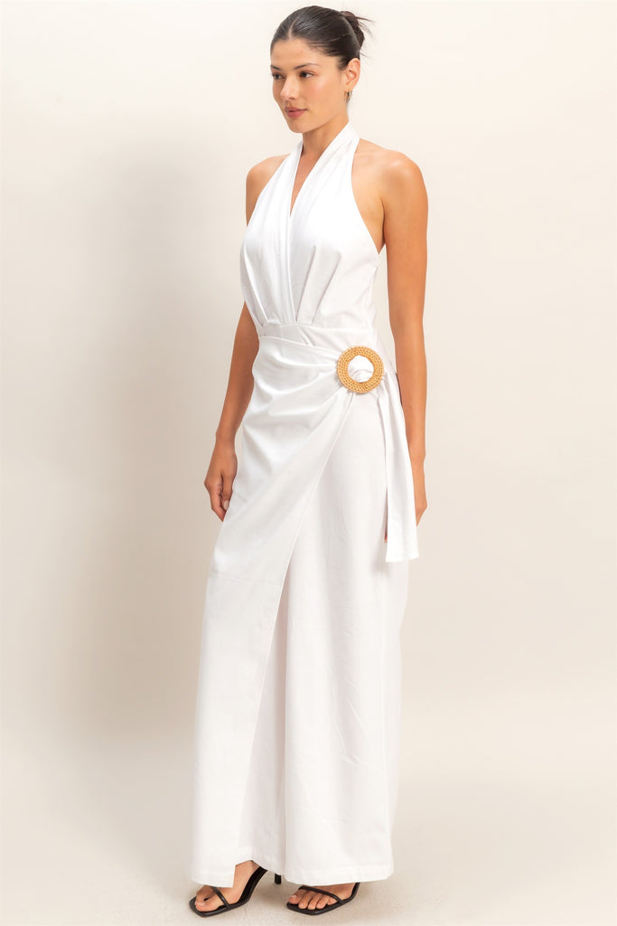 Jumpsuit blanco de diseño halter con escote profundo y silueta amplia que estiliza la figura. Cuenta con pantalón de pierna ancha y detalle tipo wrap en la cintura con hebilla decorativa que aporta un toque sofisticado y moderno.