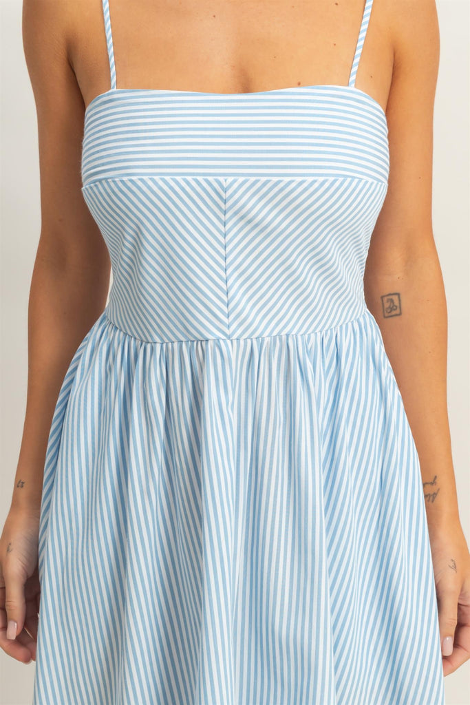 Este vestido midi azul cielo de rayas para mujer combina una parte superior estructurada con falda fluida que aporta movimiento y ligereza.
