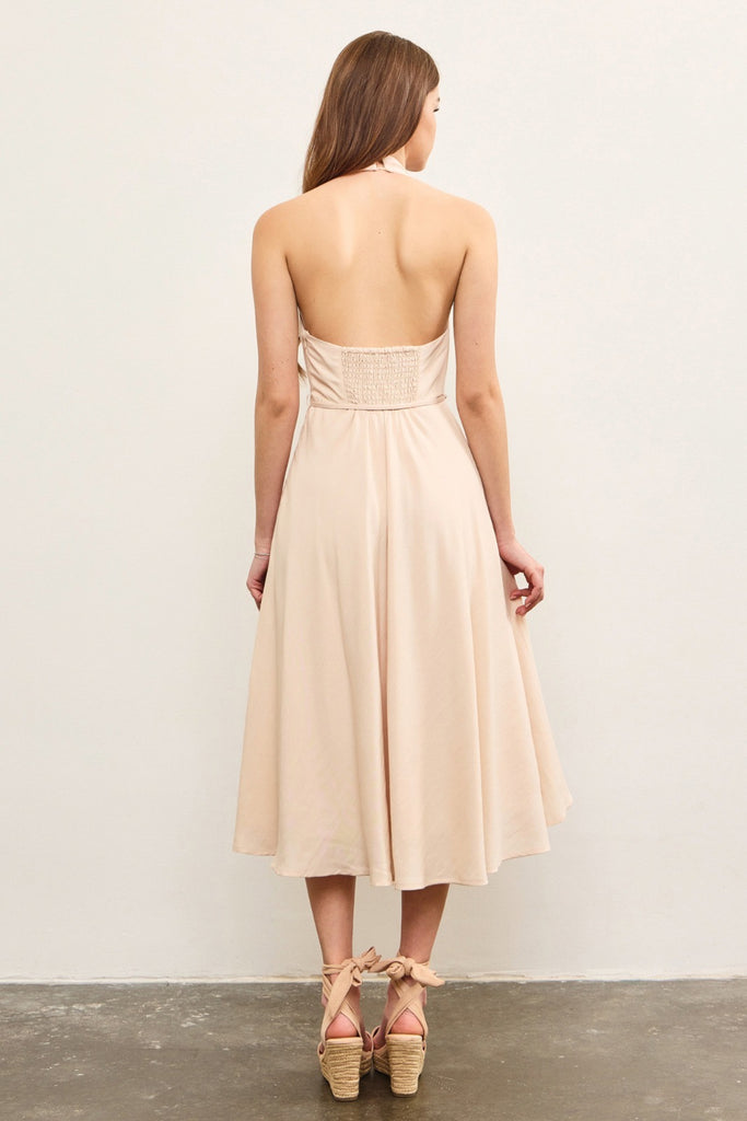 Este vestido midi halter en tono beige nude estiliza la silueta con su escote profundo en V y cintura ajustable que define la figura con delicadeza. Su espalda descubierta aporta un toque femenino y sofisticado ideal para ocasiones especiales.
