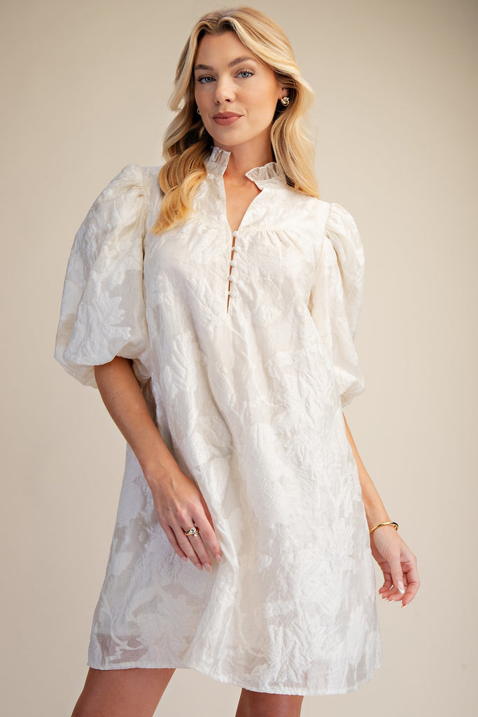 Este vestido corto blanco texturizado para mujer destaca por su tela con relieve floral y su silueta suelta tipo A que aporta movimiento y comodidad.